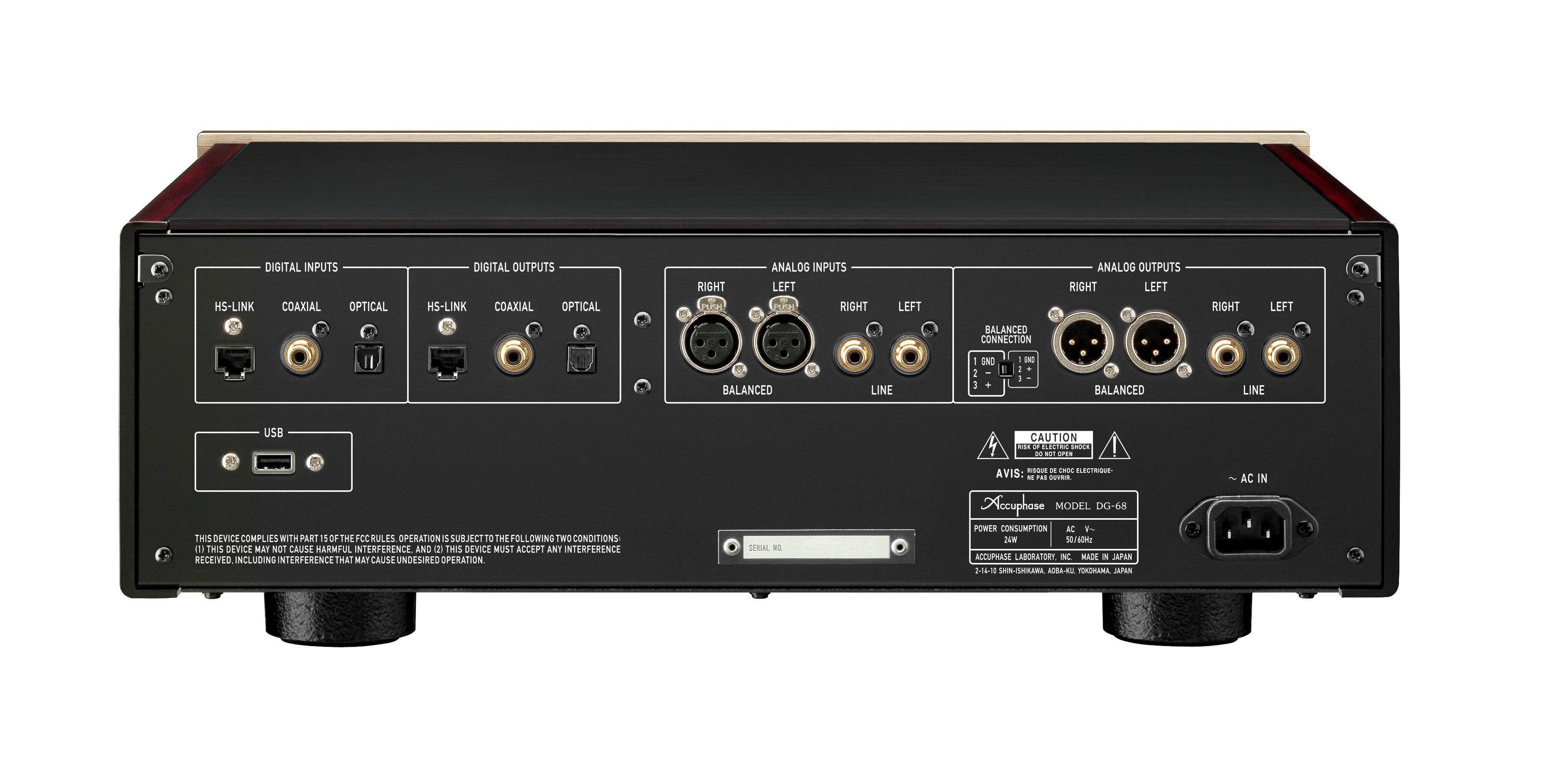 Der Accuphase DG-68 verwendet als Herzstück einen 40-Bit-Gleitkomma-DSP-Chip (ADSP-21489) von Analog Devices und setzt somit auf neuste High End Signalverarbeitungstechnologie. Mühelos kann der DG-68 dank seiner A/D Wandlung mit 32-Bit-A/D-Wandlerchip AK5578EN (Asahi Kasei Microdevices) in vierfacher Parallelkonfiguration für jeden Kanal und der D/A Wandlung mit 32-Bit-D/A-Wandlerchip ES9028PRO (ESS Technology) in achtfacher Parallelkonfiguration, sowohl analoge als auch hochauflösende digitale Quellen auf höchsten Niveau verarbeiten. Der DG-68 erlaubt die digital klanglich hochauflösende Einbindung an die mit HS-Link II ausgestatteten SACD Player und Laufwerk-Wandler Produkte. Eine Umschaltung in den HS-Link I Modus ist in den Grundeinstellungen möglich.